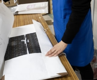 丹精込めて仕上げをしたお着物を、たとう紙に入れていきます。 -