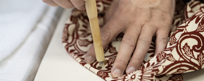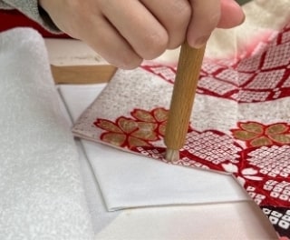 各工程を終えた後、最後の「手仕上げ」でさらに生き返らせます。着用を重ねていく上での袋やくるいも丹精込めて一枚一枚、仕上げをしていきます。着られる方の笑顔を思い浮かべて、丁寧な手仕上げを徹底しています。