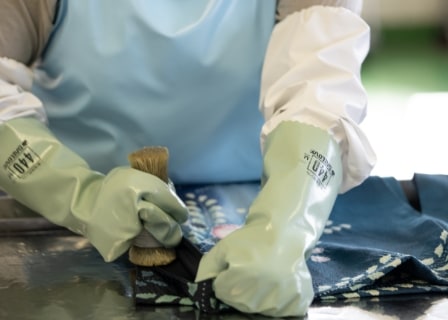 「幸あわせ」の丸洗いは職人さんが1枚、1枚汚れている部分をブラッシングした後、機械に入れて、蒸留したキレイな油性の溶剤で洗います。その後、適温で12時間以上乾燥させ、1枚1枚手仕上げをしていきます。
