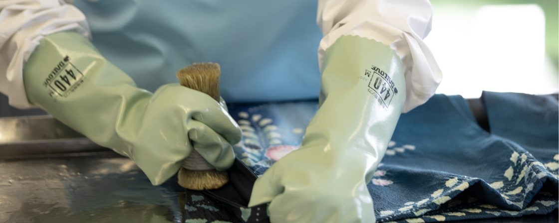 汚れのひどい箇所を中心に「ブラッシング・下洗い」をします。その後、ネットに入れて専用溶剤を使った「全体洗い」をします。お着物に合わせて、時間や洗い方を調整し、丁寧に加工していきます。