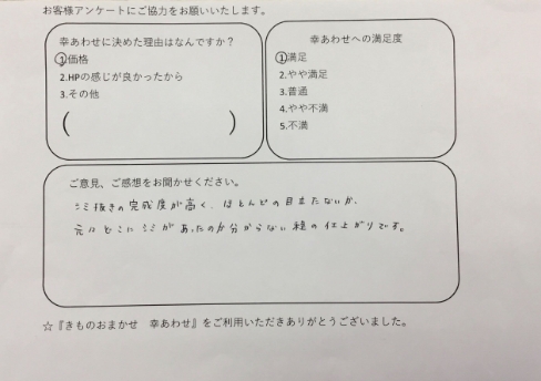 シミのお見積りだけではなく、どうされたいかもコメントいただければ、どうすればきものにとって一番良いか相談させていただきながらお見積りをいたします。 -