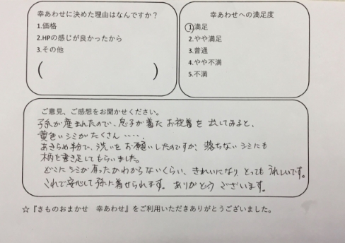 綺麗になりとっても嬉しいです孫が産まれたので、息子が着たお祝着を出してみると、黄色いシミがたくさん、、、